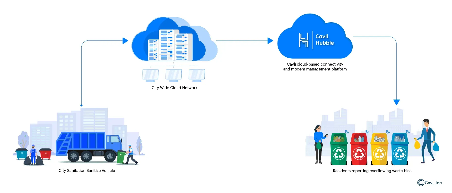 Imagine a scenario where residents report overflowing bins via a city’s mobile application. The city’s waste disposal facility leverages the AT command capabilities of the Cavli C10QM module to enable real-time location tracking and control of its utility vehicles. Integrated with Cavli Hubble, a centralize cloud-based application processes incoming requests, dynamically recalculates the optimal route, and transmits updated waypoints to the nearest available vehicle for efficient task execution. The vehicle, guided by live NMEA GNSS data and telemetry, bypasses traffic congestion to address the issue swiftly, eliminating manual intervention. For city residents, the technology delivers efficient public services by optimizing waste management, snow removal, and infrastructure maintenance, reducing service delays, and enhancing urban functionality.