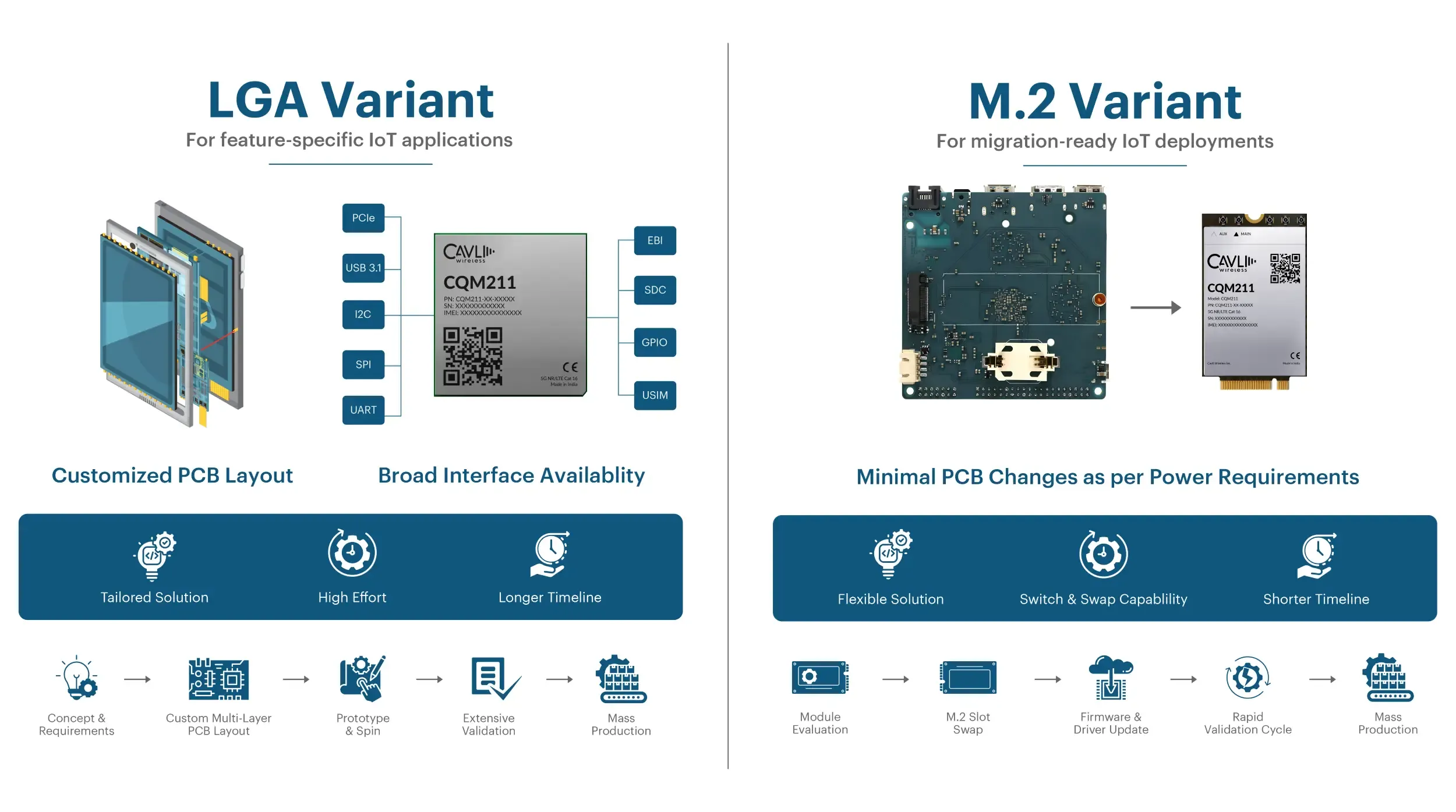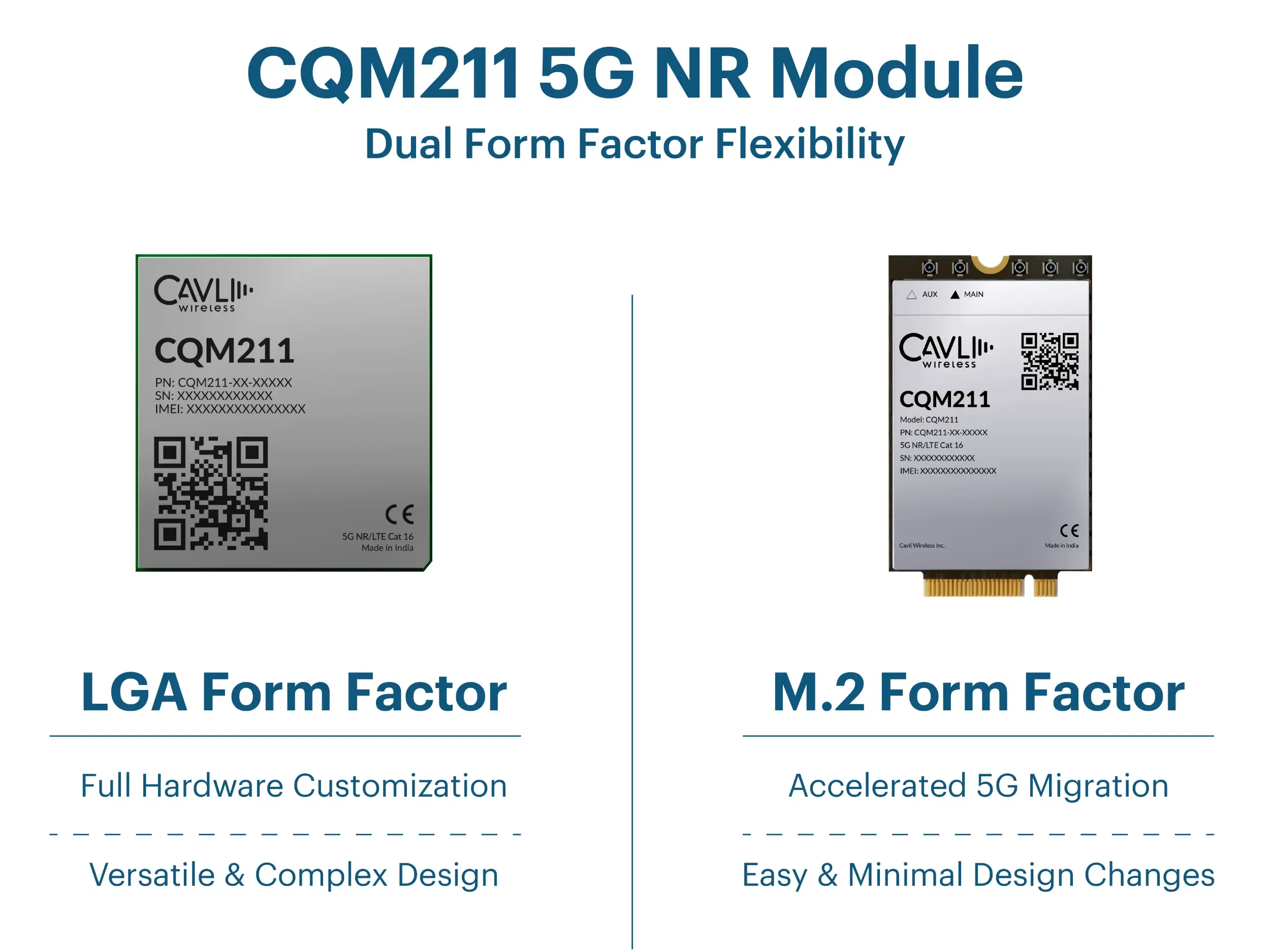 CQM211 is available in two form factors: LGA and M.2. By offering both, Cavli enables two distinct OEM paths with the same core 5G platform: