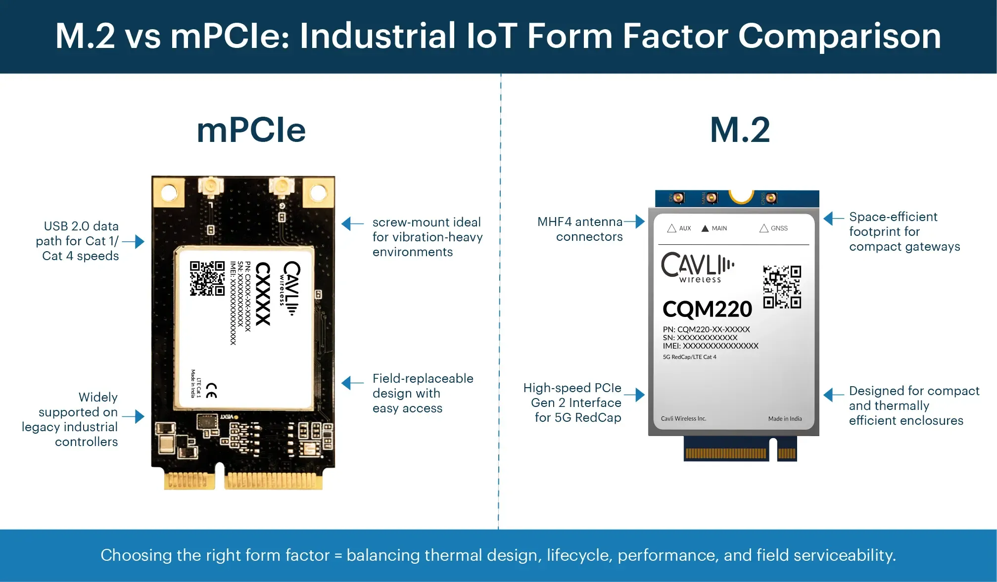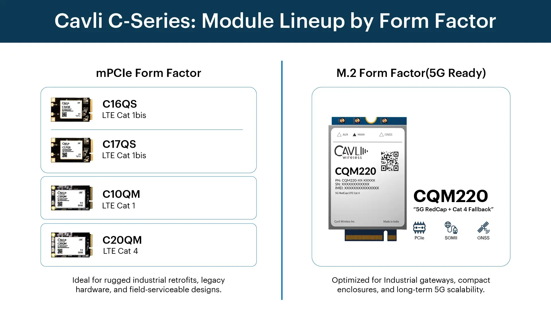 Industrial IoT design is no longer only about picking the right cellular technology. The hardware form factor you choose for the modem determines how your router, gateway, or controller scales, how easily it can be serviced in the field, and its readiness for the next generation of networks. Cavli Wireless supports both major modem form factors for industrial IoT deployments - M.2 and mPCIe.The M.2 line is anchored by the CQM220 5G RedCap platform, which brings Cat 4 fallback, PCIe Gen 2.0, SGMII, and multi-constellation GNSS in a compact footprint, while the mPCIe family covers the LTE tiers with C16QS and C17QS for Cat 1bis efficiency, and C11QM, C10QM, and C20QM for LTE Cat 1 and Cat 4 deployments.