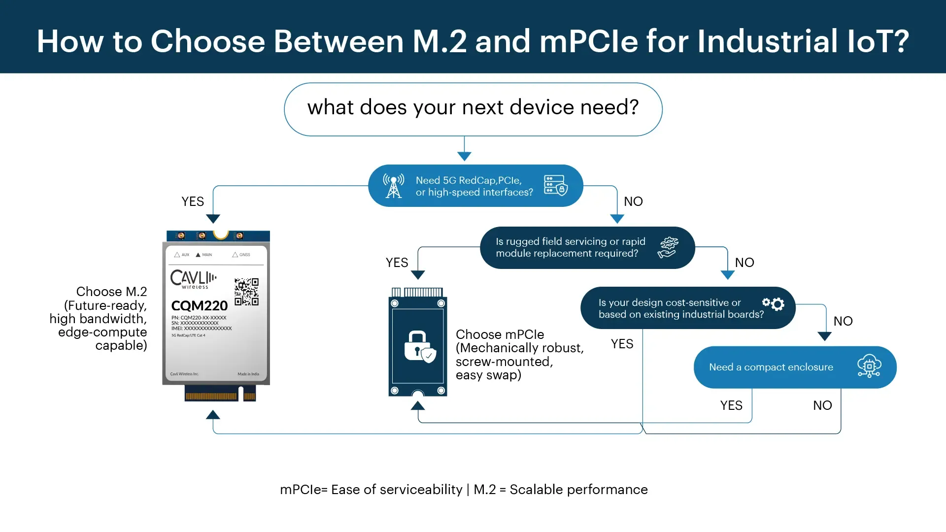 In the end, choosing between M.2 and mPCIe comes down to how you want your industrial IoT hardware to evolve and how your devices will be serviced over their lifetime. mPCIe delivers durability and straightforward field replacement that keeps legacy deployments running with minimal downtime. It remains the dependable choice for cost-sensitive routers and controllers that need predictable behavior in harsh environments. M.2 pushes forward with higher throughput, cleaner high-speed interfaces, and a roadmap aligned with 5G RedCap and future network upgrades. It enables slimmer, smarter gateways that can handle edge workloads without extra silicon. At its core, the decision follows a simple logic: pick mPCIe when reliability, ease of maintenance, and ecosystem maturity drive the design; choose M.2 when performance headroom, long-term scalability, and next-generation capability matter most.
