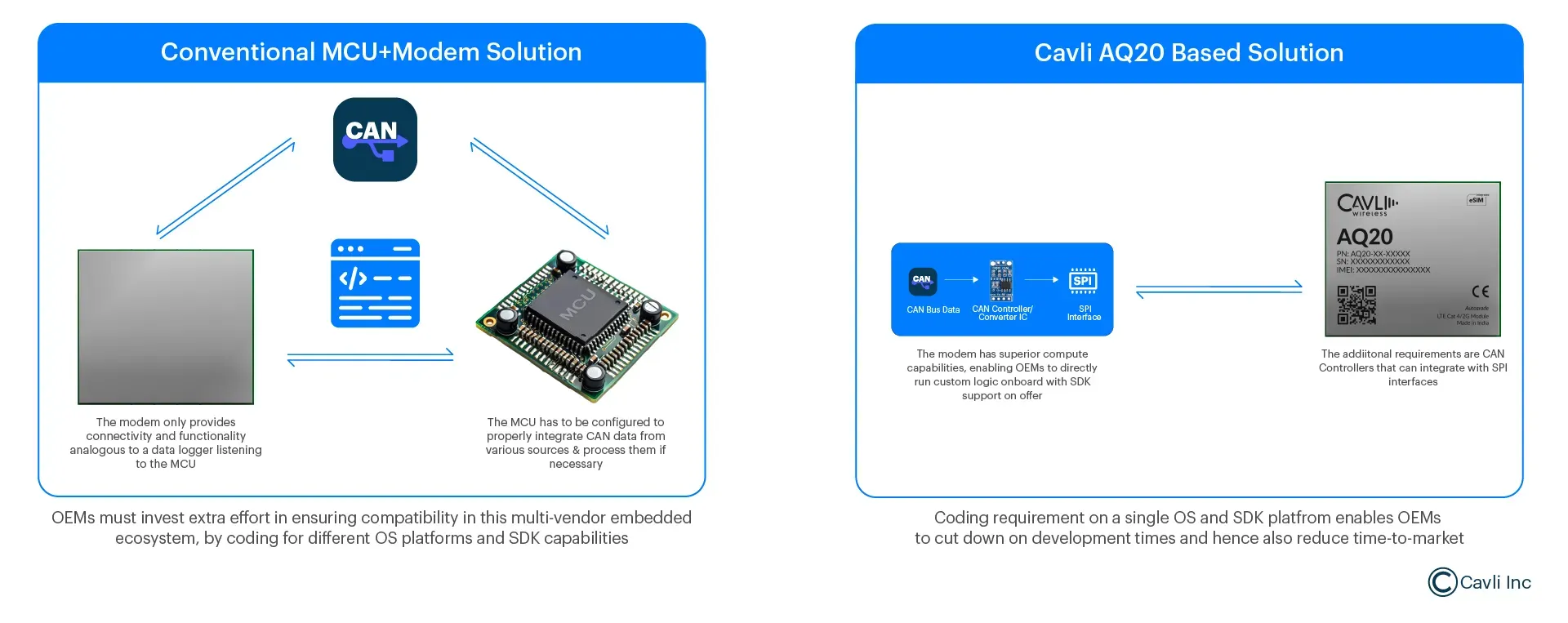 The automotive industry is racing toward a connected future, with vehicles evolving into data‑driven ecosystems that generate gigabytes of data every hour. The Controller Area Network (CAN) bus protocol remains the backbone of vehicle communication, enabling Electronic Control Units (ECUs) to manage critical functions like engine control, safety systems, and infotainment. Yet, integrating modern cellular IoT modules with CAN‑based architectures poses challenges for Original Equipment Manufacturers (OEMs) and Original Design Manufacturers (ODMs), often requiring costly custom hardware. Cavli Wireless’s AQ20 IoT module tackles this with its innovative SPI‑to‑CAN integration, eSIM‑enabled global connectivity, and compliance with stringent automotive standards, offering a scalable, cost‑efficient solution for next‑generation connected vehicles.